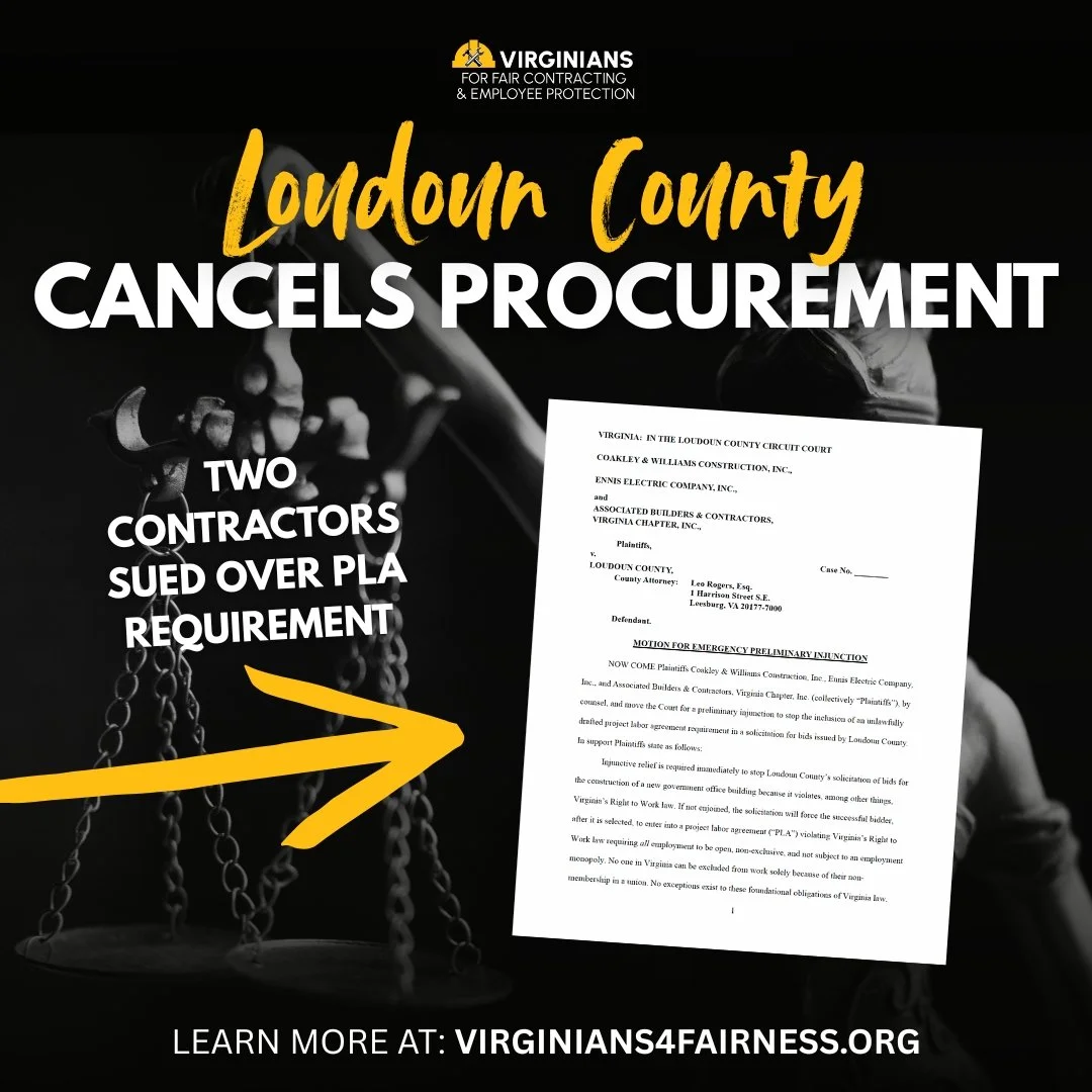 Today, Loudoun County cancelled the procurement of a new government office building after two contractors sued the County over the procurement’s requirement for a Project Labor Agreement (PLA) last week. The lawsuit – filed by Coakley & Williams Construction, Ennis Electric, and the Associated Builders and Contractors Virginia Chapter – argued that the PLA mandate violated Virginia’s Right to Work Law, the Virginia Public Procurement Act, and the Virginia Constitution.